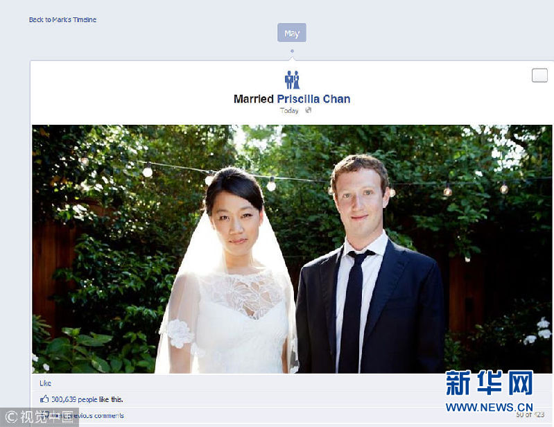 2012年5月19日讯,脸书创始人马克·扎克伯格在自己的脸书页面更新了婚恋状态为已婚,公布与妻子普莉希拉·陈合影。(图片来源:视觉中国)