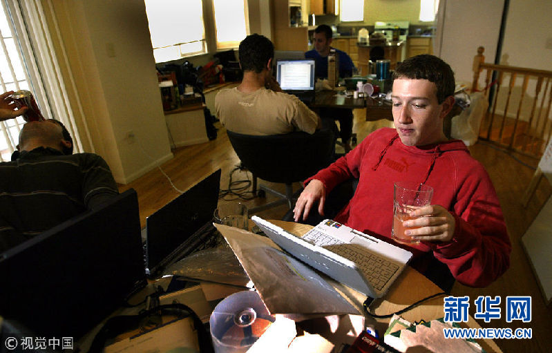 当地时间2005年1月6日,美国加州帕洛阿尔托,Facebook创始人兼首席执行官马克·扎克伯格与4名哈佛学生在租住的公寓内办公。(图片来源:视觉中国)