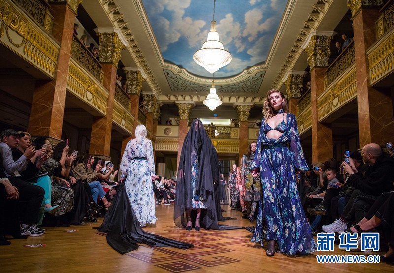 4月10日,哈萨克斯坦2018—2019秋冬时装周,模特在展示时装。新华网发 米赫耶夫摄