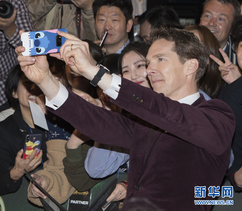 4月12日,《复仇者联盟3:无限战争》演员康伯巴奇在韩国首尔的首映礼红毯上同影迷自拍合影。