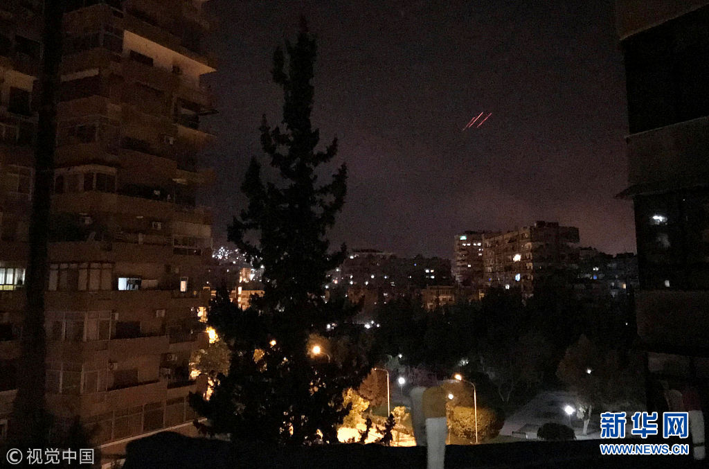 4月14日,叙利亚大马士革,特朗普决定联合英国和法国对叙利亚进行精确打击,大马士革传出爆炸声,叙利亚方面进行反击。叙利亚阿拉伯叙利亚通讯社(SANA)报道,叙政府军在大马士革以南地区击落13枚导弹。叙利亚国家电视台此前称美英法三国对叙利亚“发动了侵略”。(图片来源:视觉中国)