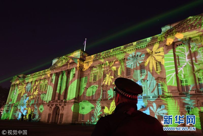 英国白金汉宫外墙秒变“雨林” 梦幻灯光秀呼吁人们关注环保