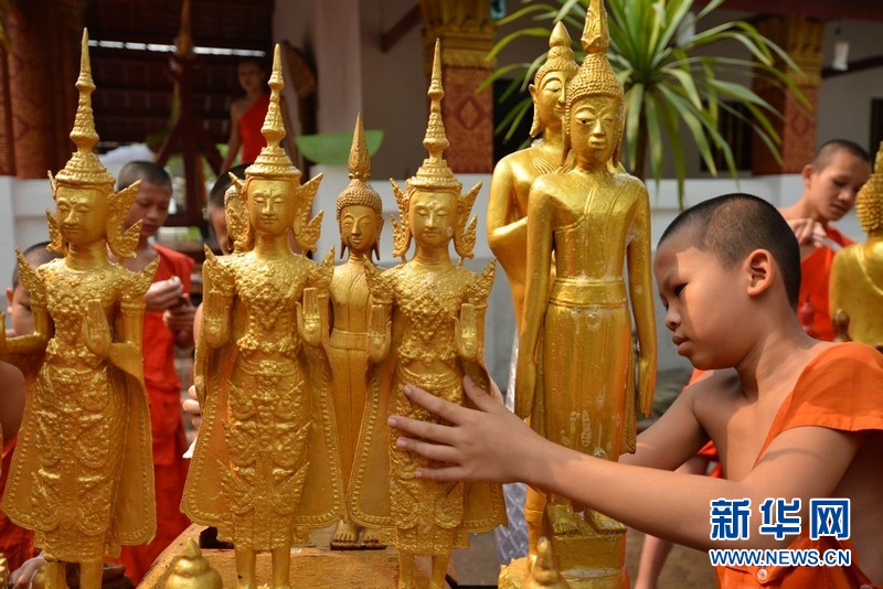 4月14日,琅勃拉邦,老挝僧人清洗佛像迎接泼水节。