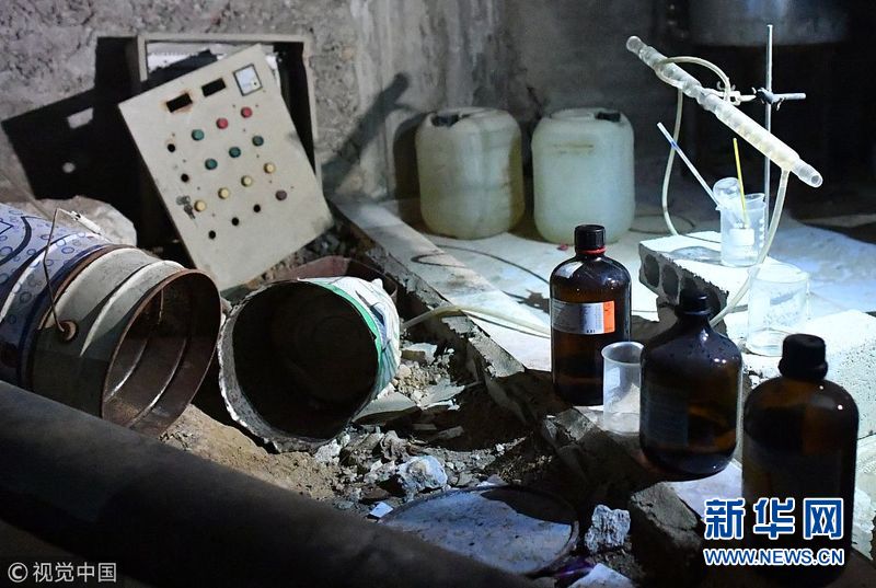 4月18日,叙利亚杜马,在杜马镇发现的“化武实验室”。据报道,俄罗斯士兵上周二在叙利亚杜马镇一栋居民楼的地下室里发现了一个储存生产化学武器原料的仓库,此外俄军还称,他们在该仓库中还发现了一个汽缸,类似于此前武装分子用来传播虚假新闻时称可用来“生产氯气”的气罐。(图片来源:视觉中国)