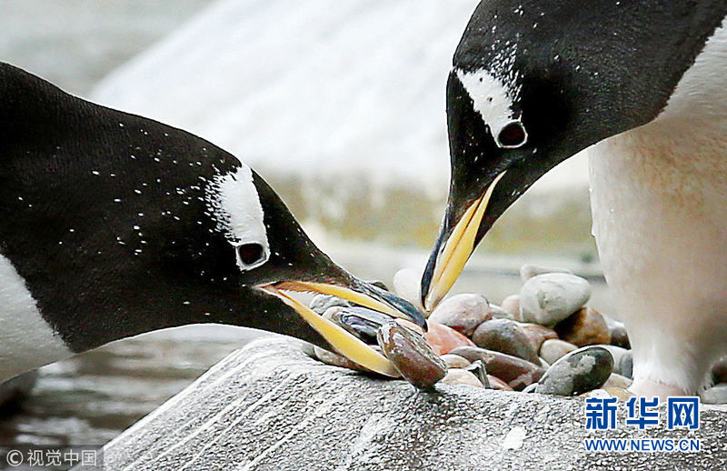 英国动物园企鹅进入求偶期 雄企鹅比拼“捡石头”求青睐