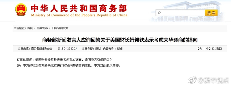 新华网北京4月22日电 商务部网站消息,有媒体提问:美国财长姆努钦表示考虑来华磋商,请问中方有何回应?答:中方已收到美方希来北京进行经贸问题磋商的信息,中方对此表示欢迎。 (据新华社“新华视点”微博报道)