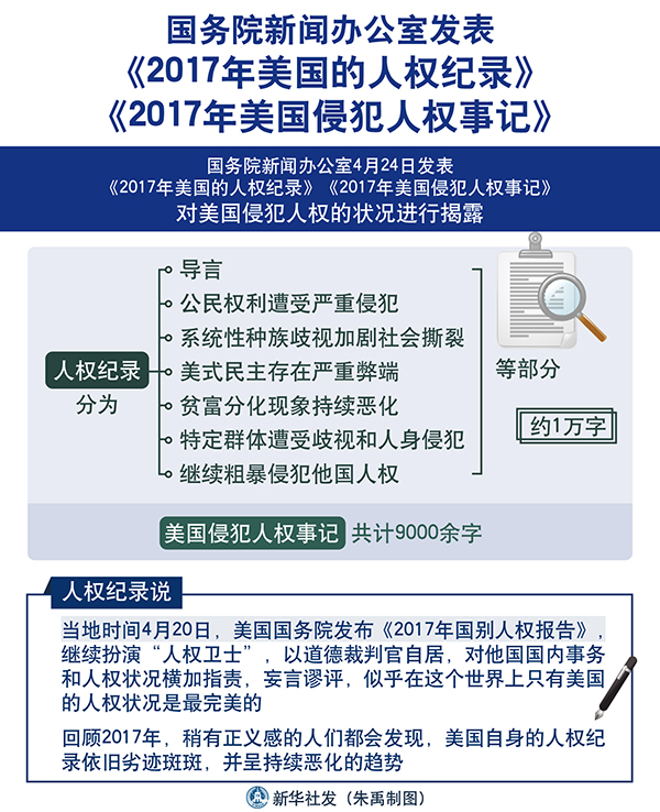 新华社北京4月24日电(记者黄小希、程卓)国务院新闻办公室24日发表《2017年美国的人权纪录》《2017年美国侵犯人权事记》,对美国侵犯人权的状况进行揭露。
