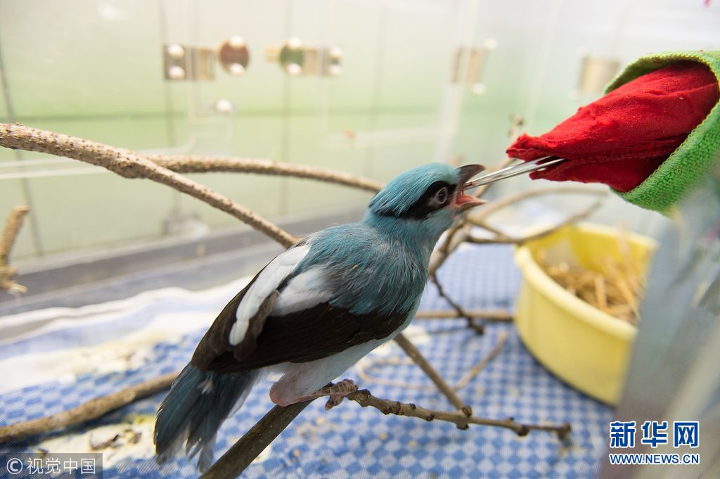 4月23日,捷克布拉格,一名动物园饲养员利用手偶假扮成“鸟妈妈”向一只仅43天大的爪哇绿鹊喂食。(图片来源:视觉中国)