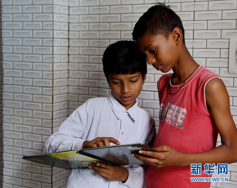 4月20日,在印度首都新德里Lal Kuan地区一家图书馆,两名男孩在读书。新华网记者张迺杰 摄