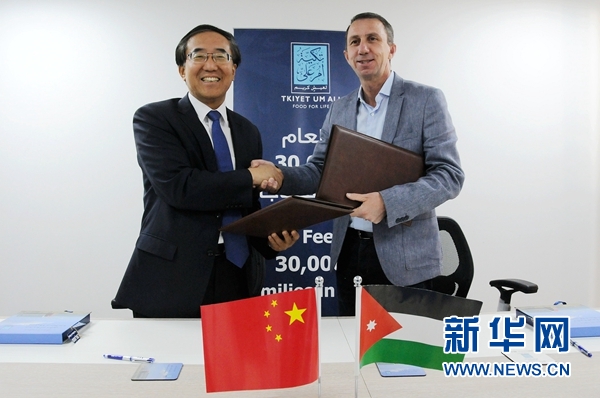 中国驻约旦大使潘伟芳(左)和“阿里之母”慈善组织执行主任萨米尔·巴卡尔签字后握手。新华网记者林晓蔚 摄