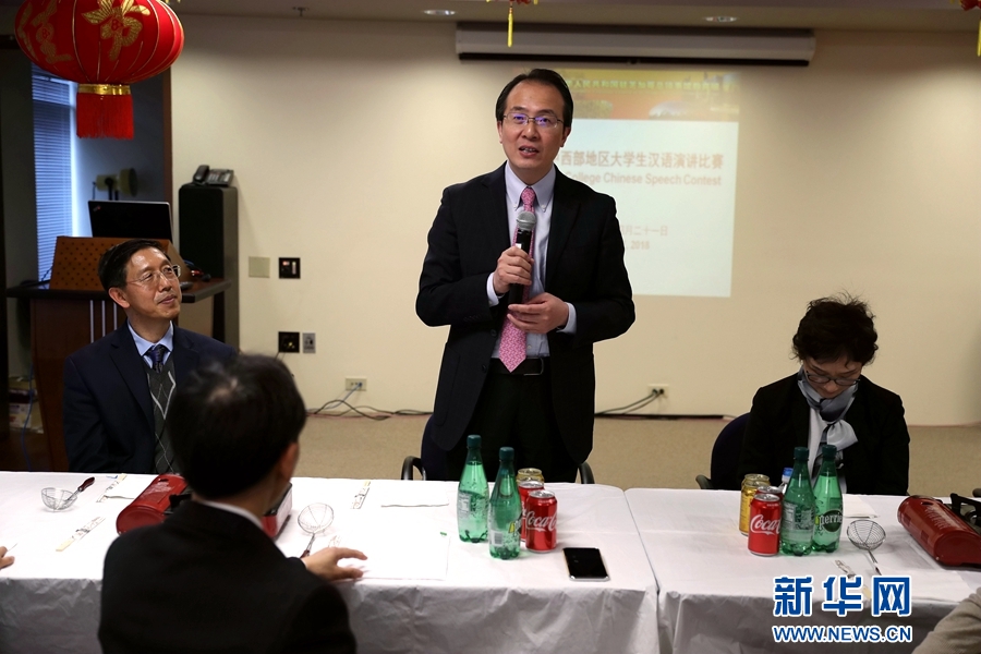 4月21日,在美国芝加哥,中国驻芝加哥总领事洪磊(中)在赛后的招待会上对参选选手发表讲话。新华网记者汪平 摄