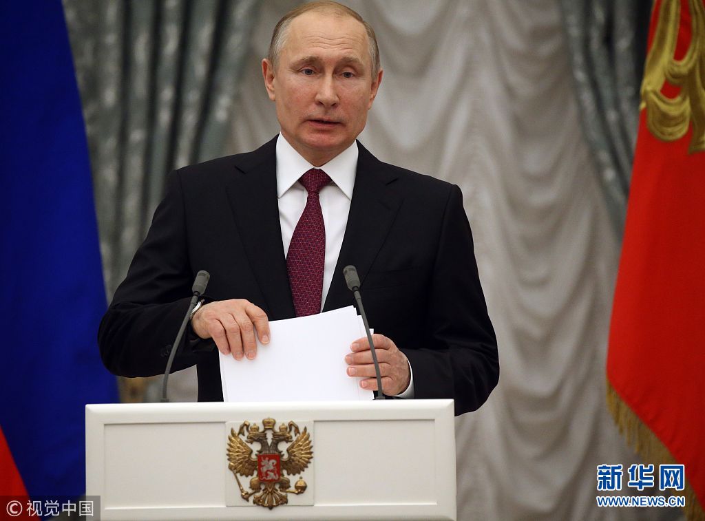 4月25日,俄罗斯莫斯科,俄罗斯总统普京出席颁奖仪式。普京当天在克里姆林宫向5名劳动工作者颁发“劳动英雄”奖章,以表彰他们为国家和人民建立的特殊劳动功勋。(图片来源:视觉中国)