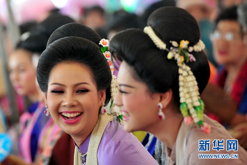 4月22日,泰国沙没巴干府帕巴登县,泰国女子穿传统服装参加花车游行庆祝活动。22日是当地泼水节庆祝的最后一天。新华网发 拉亨摄