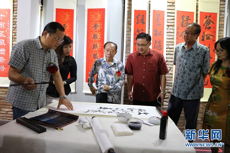 揭牌仪式后,书法家张书溢(左一)现场书写中国传统书法。新华网发 王大玮摄