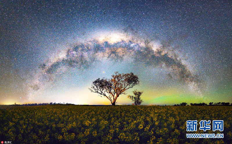 这些震撼的美景足够令所有的人沉醉。画面中星光熠熠的银河盘旋在澳洲各处的夜空中。这些深蓝紫色的星光与亮白的灯塔、与开着黄色花朵的田野与礁岩前的绿色植被形成强烈对比,美丽至极。来自新南威尔士州的29岁摄影师、社交媒体营销员大卫(David Magro)拍摄下了这些震撼的画面。(图片来源:东方IC)