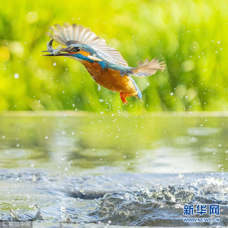 4月20日,英国北约克郡,一只翠鸟俯冲进水里捉鱼,一池清水被搅出很大水花。(图片来源:视觉中国)