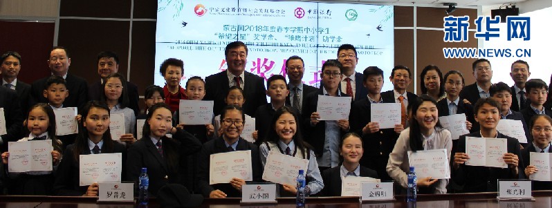 新华网乌兰巴托28日电(意特格乐)由“中蒙文化教育基金会”发起的2018年春季“希望之星”、“雏鹰计划”奖励项目颁奖仪式,27日在中国银行乌兰巴托代表处举行,蒙古国38位优秀中小学生获奖。中国驻蒙古国大使邢海明、文化参赞李微,中蒙文化教育暨社会基金会理事长代兴军等中蒙各界上百人参加了当天的颁奖仪式。