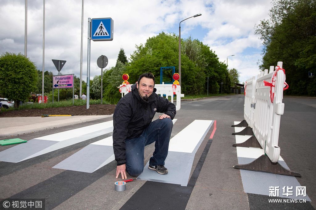 当地4月30日,德国施马尔卡尔登镇现3D人行道,该设计旨在为提高道路安全。(图片来源:视觉中国)