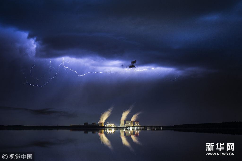 当地时间4月28日,德国克利滕,巴尔瓦尔德湖畔褐煤发电站上空出现闪电,景象壮观。(图片来源:视觉中国)