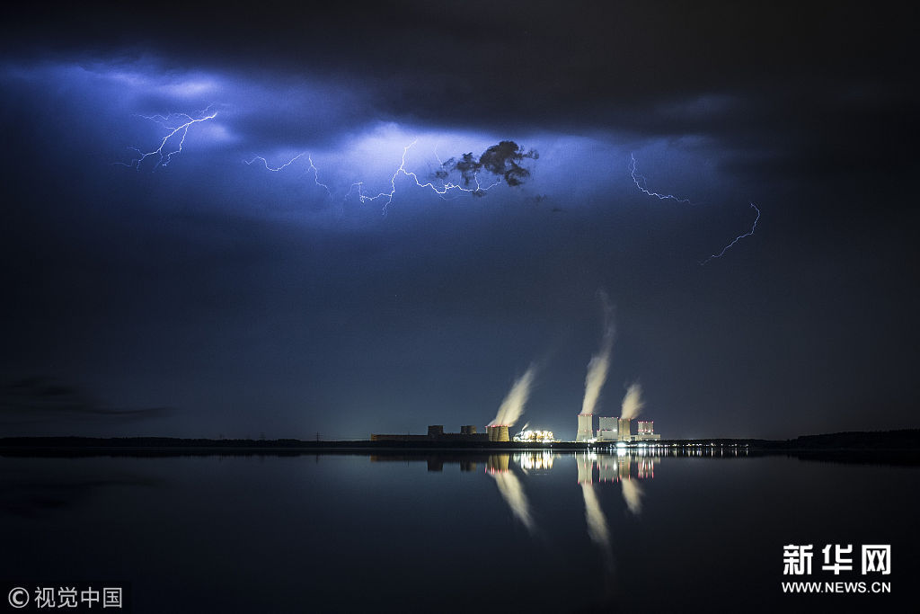 当地时间4月28日,德国克利滕,巴尔瓦尔德湖畔褐煤发电站上空出现闪电,景象壮观。(图片来源:视觉中国)