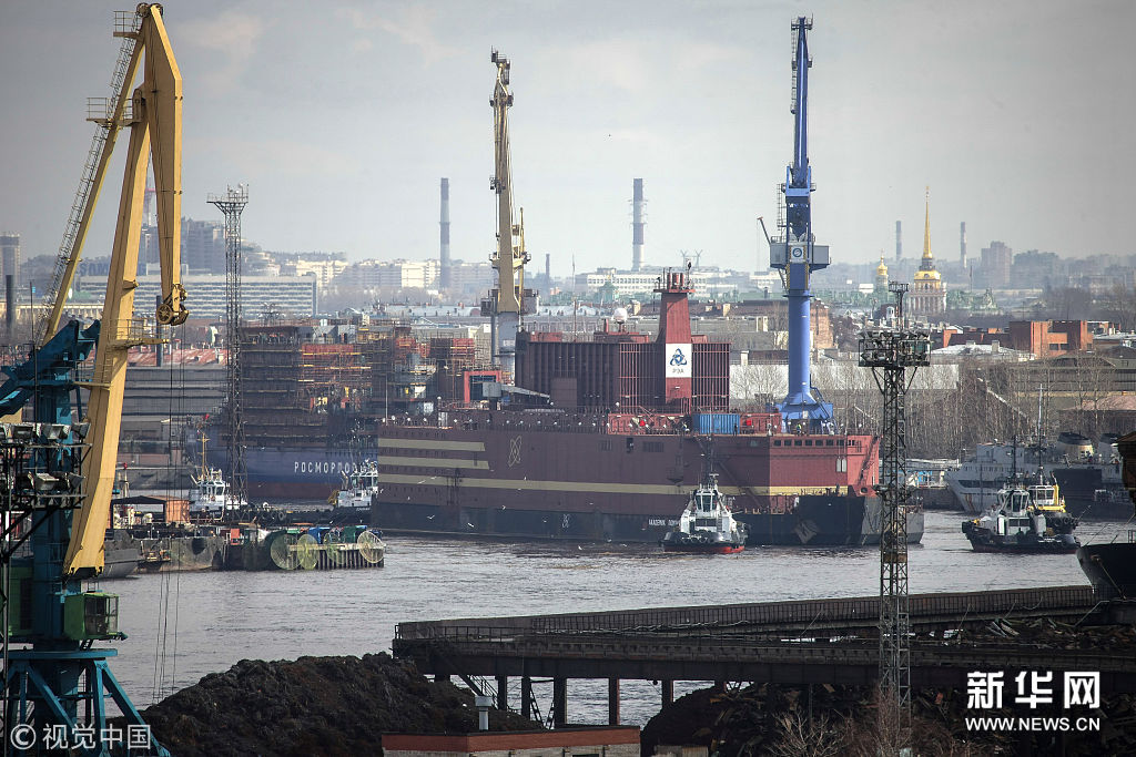 当地时间4月28日,俄罗斯圣彼得堡,包含两座核反应堆的俄罗斯首座浮动核电站“罗蒙诺索夫院士”号正被拖船拖离圣彼得堡。这座漂浮在水上的核电站也被戏称为“全球最大移动电源”。(图片来源:视觉中国)