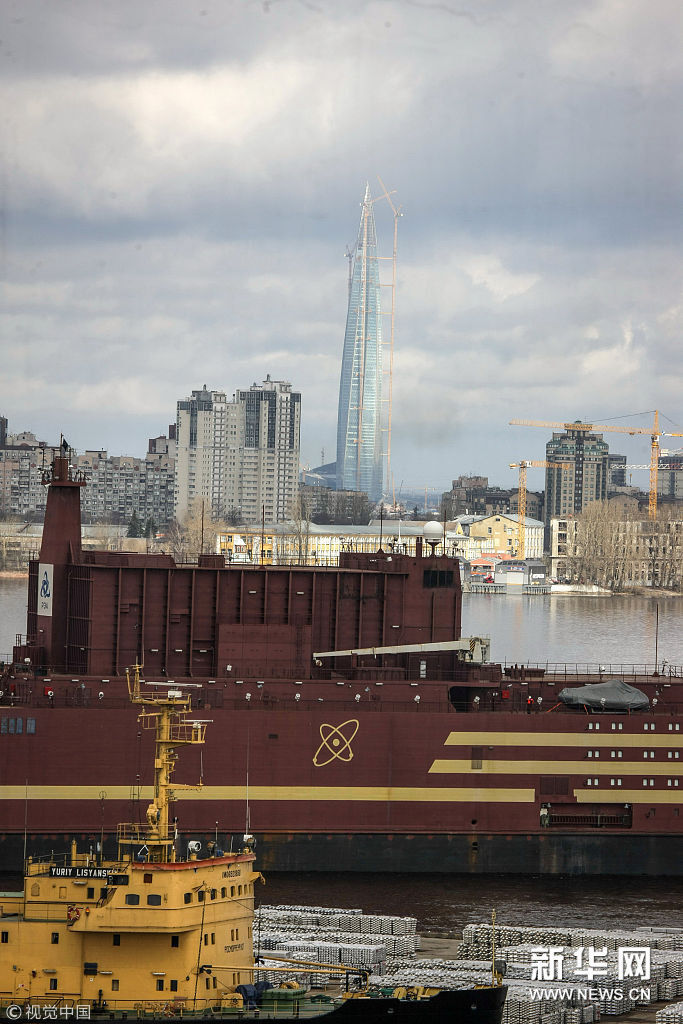 当地时间4月28日,俄罗斯圣彼得堡,包含两座核反应堆的俄罗斯首座浮动核电站“罗蒙诺索夫院士”号正被拖船拖离圣彼得堡。这座漂浮在水上的核电站也被戏称为“全球最大移动电源”。(图片来源:视觉中国)