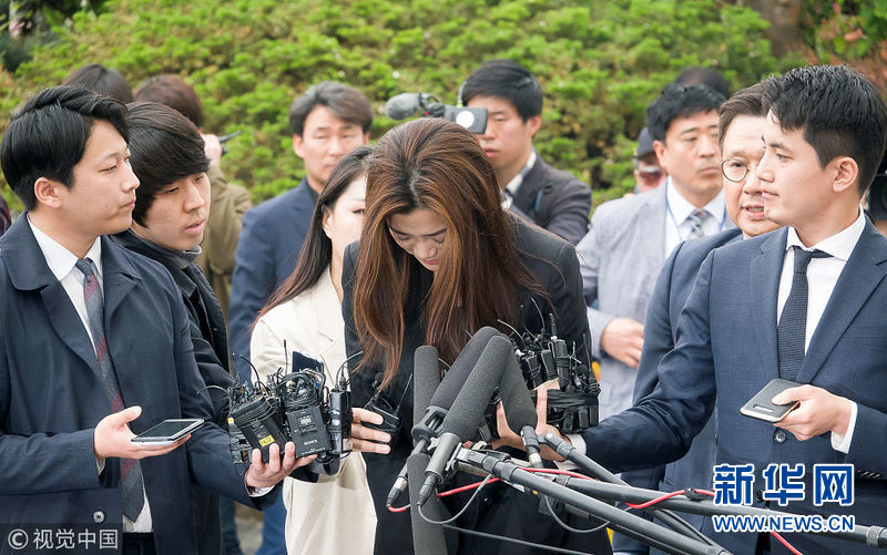 5月1日,韩国首尔,韩国韩进集团总裁赵亮镐次女、大韩航空主管广告事务的专务赵显旼现身警局接受讯问。赵显旼上月16日在大韩航空仁川机场总公司向广告代理商A公司的广告组组长大声喊叫,并用水泼脸将其轰走,涉嫌暴力和业务妨碍行为罪。(图片来源:视觉中国)
