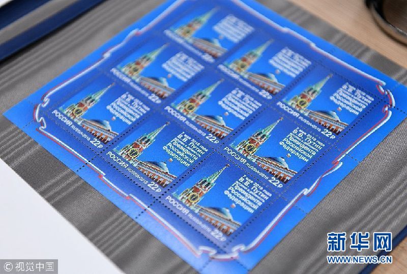 当地时间2018年5月7日,俄罗斯莫斯科,俄罗斯发行普京就职纪念邮票。(图片来源:视觉中国)