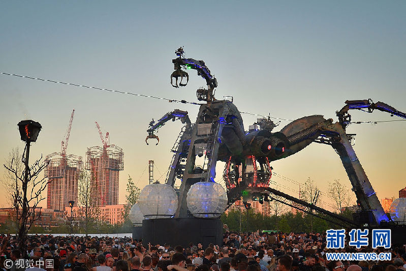 当地时间2018年5月5日,英国伦敦,民众在伊丽莎白女王公园参加阿卡迪亚10周年庆典。阿卡迪亚是格拉斯顿伯里音乐节的众多环节之一。其代表就是重达50吨的阿卡迪亚机械蜘蛛。(图片来源:视觉中国)