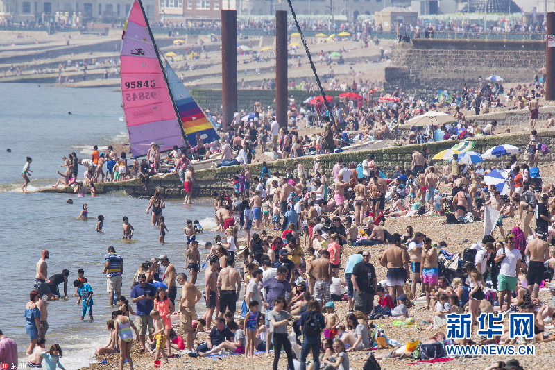 当地时间2018年5月6日,英国布莱顿,成千上万的英国民众前往布莱顿霍夫海滩度假,过去这个周末是40年来最热的五月银行假日。(图片来源:东方IC)