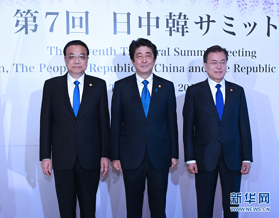 当地时间5月9日上午,国务院总理李克强在东京迎宾馆同日本首相安倍晋三、韩国总统文在寅共同出席第七次中日韩领导人会议。 新华社记者饶爱民 摄