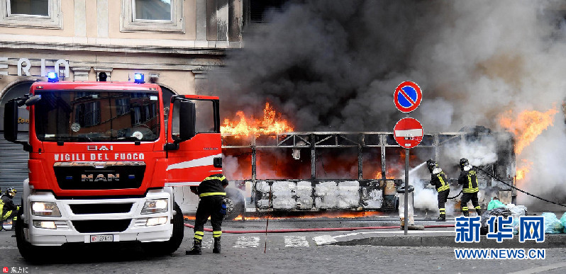 罗马市中心一辆巴士在街头着火 浓烟滚滚