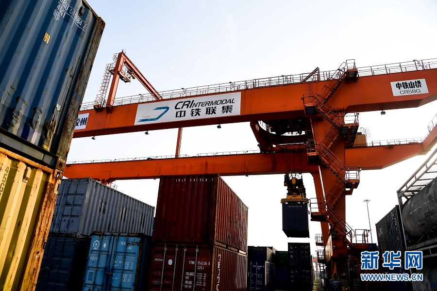 占地1800亩的中铁联集青岛中心站内,蓝色、白色的集装箱把场站装点成一片“集装箱海洋”;横穿场站的两条铁轨旁,数座巨型龙门吊繁忙作业,来自海上的货物被搬运至将远行的国际班列上……