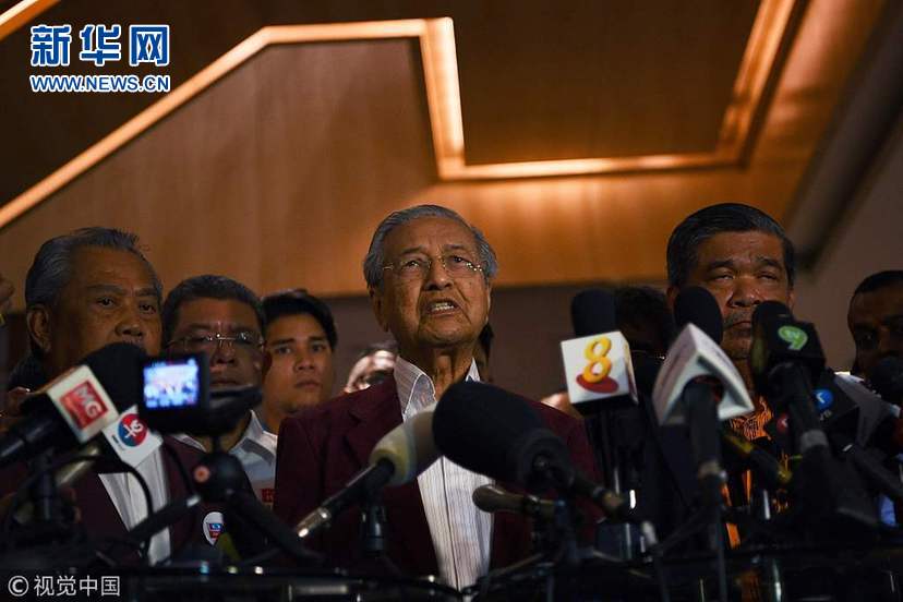 当地时间2018年5月9日,马来西亚吉隆坡,马哈蒂尔代表希望联盟召开新闻发布会。9日,马来西亚国会大选结束。10日凌晨官方点票结果显示,前总理马哈蒂尔(Mahathir)带领的希望联盟取得112席简单多数国会议席,足以筹组政府及胜出大选,并终结执政国民阵线长达60年的管治。现总理纳吉布领导的国民阵线仅获得76席。(图片来源:视觉中国)