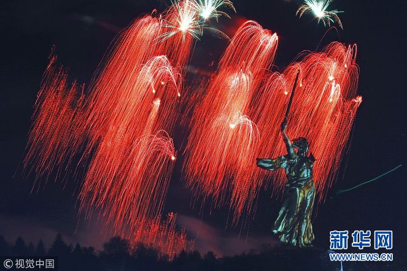 当地时间2018年5月9日,俄罗斯伏尔加格勒,当地燃放绚烂烟花,庆祝卫国战争胜利73周年。(图片来源:视觉中国)