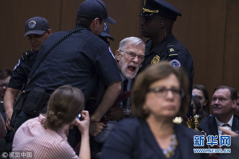 当地时间2018年5月9日,美国华盛顿,美国中央情报局候任局长吉娜·哈斯佩尔出席美国会参议院情报委员会举行的提名听证会。如果她的提名获得通过,她将成为中情局首位女性局长。图为示威者闹场。(图片来源:视觉中国)