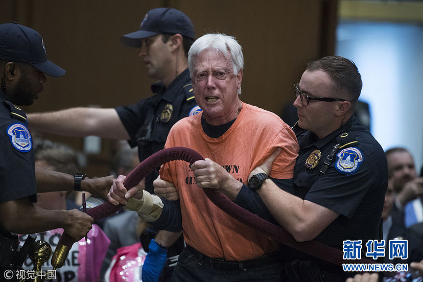 当地时间2018年5月9日,美国华盛顿,美国中央情报局候任局长吉娜·哈斯佩尔出席美国会参议院情报委员会举行的提名听证会。如果她的提名获得通过,她将成为中情局首位女性局长。图为示威者闹场。(图片来源:视觉中国)