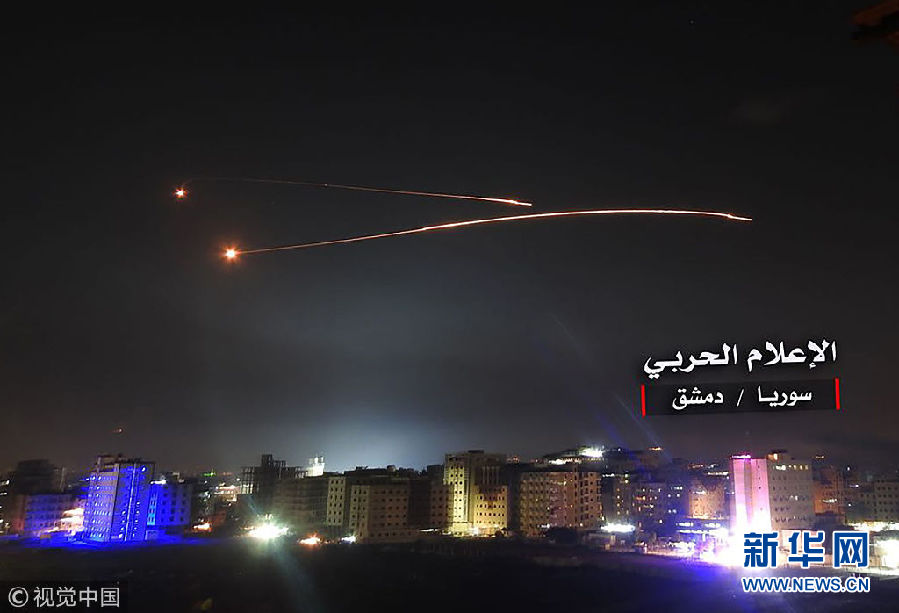 叙利亚媒体发布的图片显示叙利亚防空系统在大马士革上空拦截以色列导弹。据叙利亚国家电视台10日报道,叙利亚防空系统当天持续拦截并击落了以色列射向叙境内的数十枚导弹。(图片来源:视觉中国)