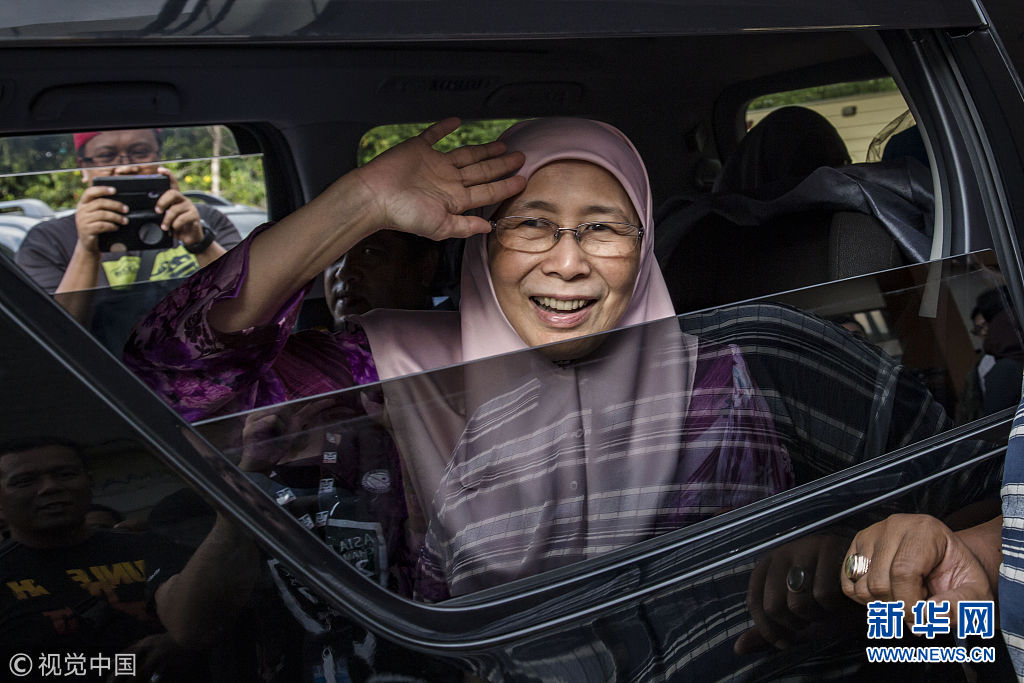当地时间2018年5月11日,马来西亚吉隆坡,马来西亚前副总理安瓦尔的夫人Wan Azizah探视狱中的丈夫。马来西亚新当选总理马哈蒂尔表示,最高元首已经同意特赦前副总理安瓦尔。