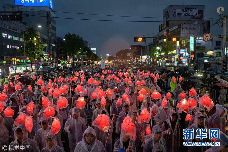 5月12日,韩国首尔,民众冒雨参加莲花灯游行,迎接佛诞节。(图片来源:视觉中国)
