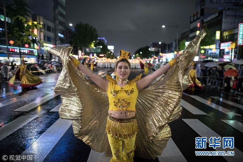 迎接佛诞节 韩国民众冒雨参加莲花灯游行