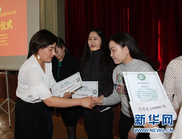 5月11日,蒙古国第六届大中学生汉字硬笔书法比赛颁奖仪式现场。新华网发 意特格乐摄