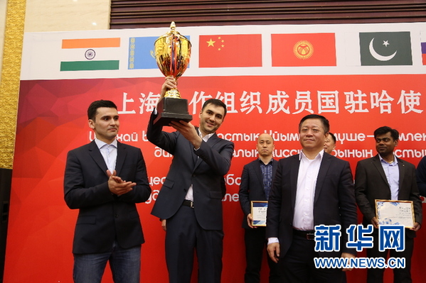 中国驻哈萨克斯坦大使张汉晖(前排右一)为冠军获得者塔吉克斯坦队颁发奖杯。 新华网发 阿比洛夫摄