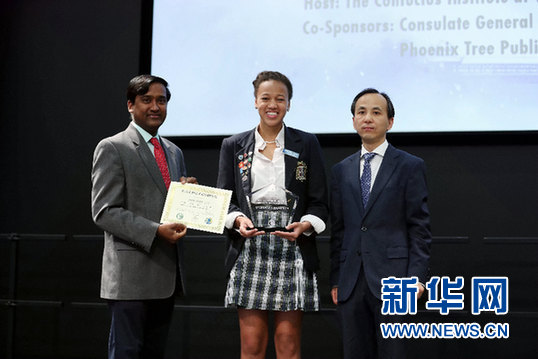在美国瓦尔普莱索大学,副校长贾伊尚卡尔·拉曼(左)和中国驻芝加哥副总领事刘军(右)给高级组冠军阿明娜·沙菲克·霍顿颁奖。新华网记者汪平 摄