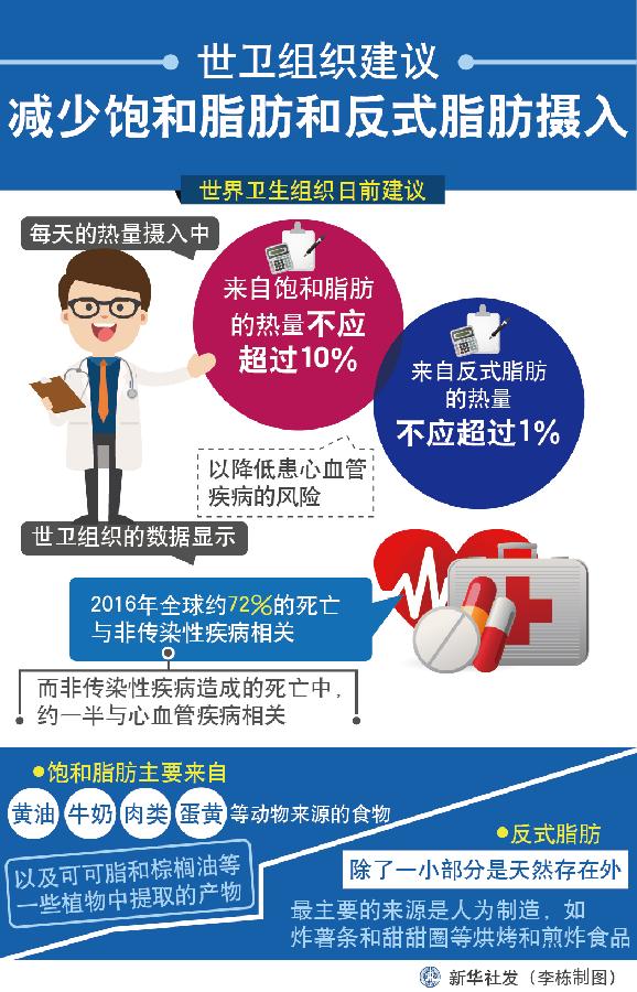 世卫组织建议减少饱和脂肪和反式脂肪摄入