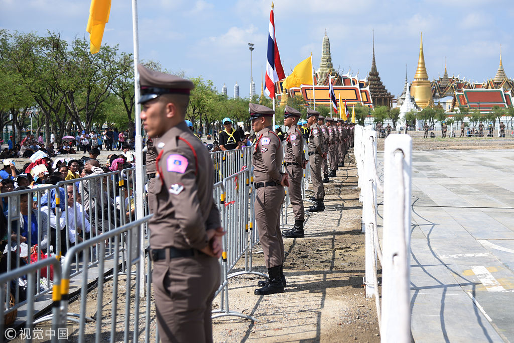 当地时间2018年5月14日,泰国曼谷,泰国农民参加一年一度皇家犁耕仪式,农民将收集的作物种子放入土地中,祈祷一年的丰收。(图片来源:视觉中国)