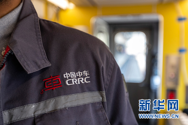 这是5月15日在美国马萨诸塞州梅德福德惠灵顿站拍摄的中车长客为波士顿橙线地铁“量身订制”的首批车辆上中车长客员工制服上的标识。新华社记者 李木子 摄