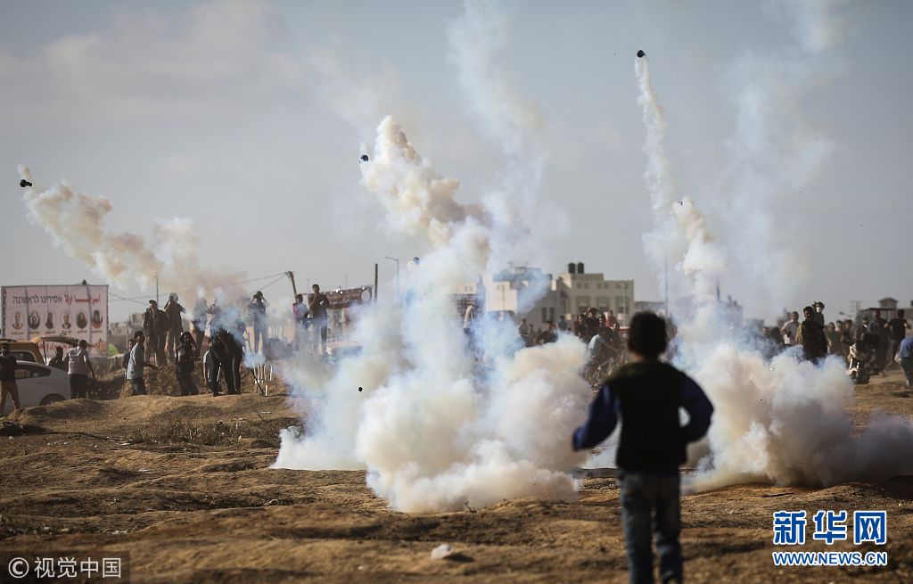 5月15日,加沙地带,巴以双方在加沙地带爆发冲突,巴勒斯坦人焚烧轮胎抗议美国大使馆迁移到耶路撒冷,以色列军则向示威者开火和发射催泪弹。这场血腥冲突已导致至少61名巴勒斯坦人死亡,2400多人受伤。(图片来源:视觉中国)