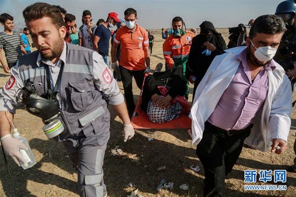 5月15日,在加沙城以东的加沙地带与以色列交界地区,人们转移一名在冲突中受伤的巴勒斯坦示威者。新华网发