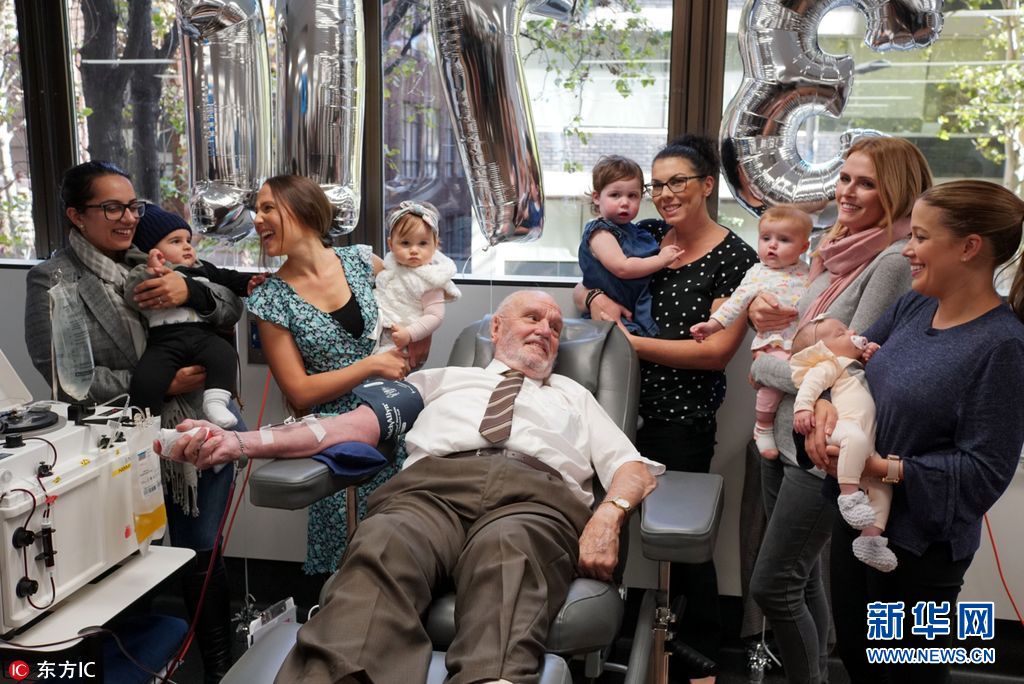 5月18日报道,澳大利亚老爷子James Harrison今年81岁了,他的血液里含有一种特殊抗体,能有效帮助新生儿避免恒河猴溶血病。本月11日,他前往当地红十字会血库,完成人生中最后一次捐血。他曾捐献过1100多次血液,成为全世界献血最多的人,挽救了上百万婴儿的性命。(图片来源:东方IC)
